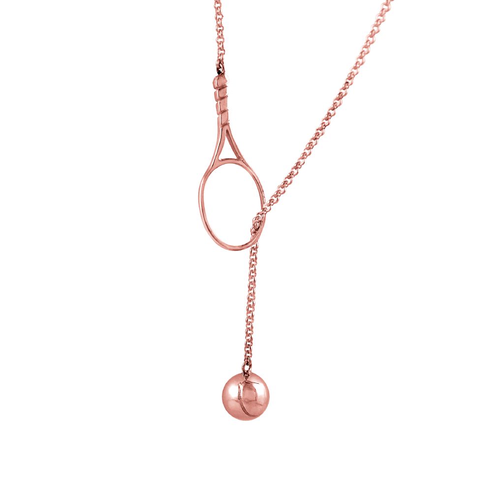 Colar folhado à ouro rosé tipo Y com bola de tênis na ponta. O mais charmoso de todos! E não se preocupe, a bolinha está presa no comprimento exato para não machucar no meio da partida.